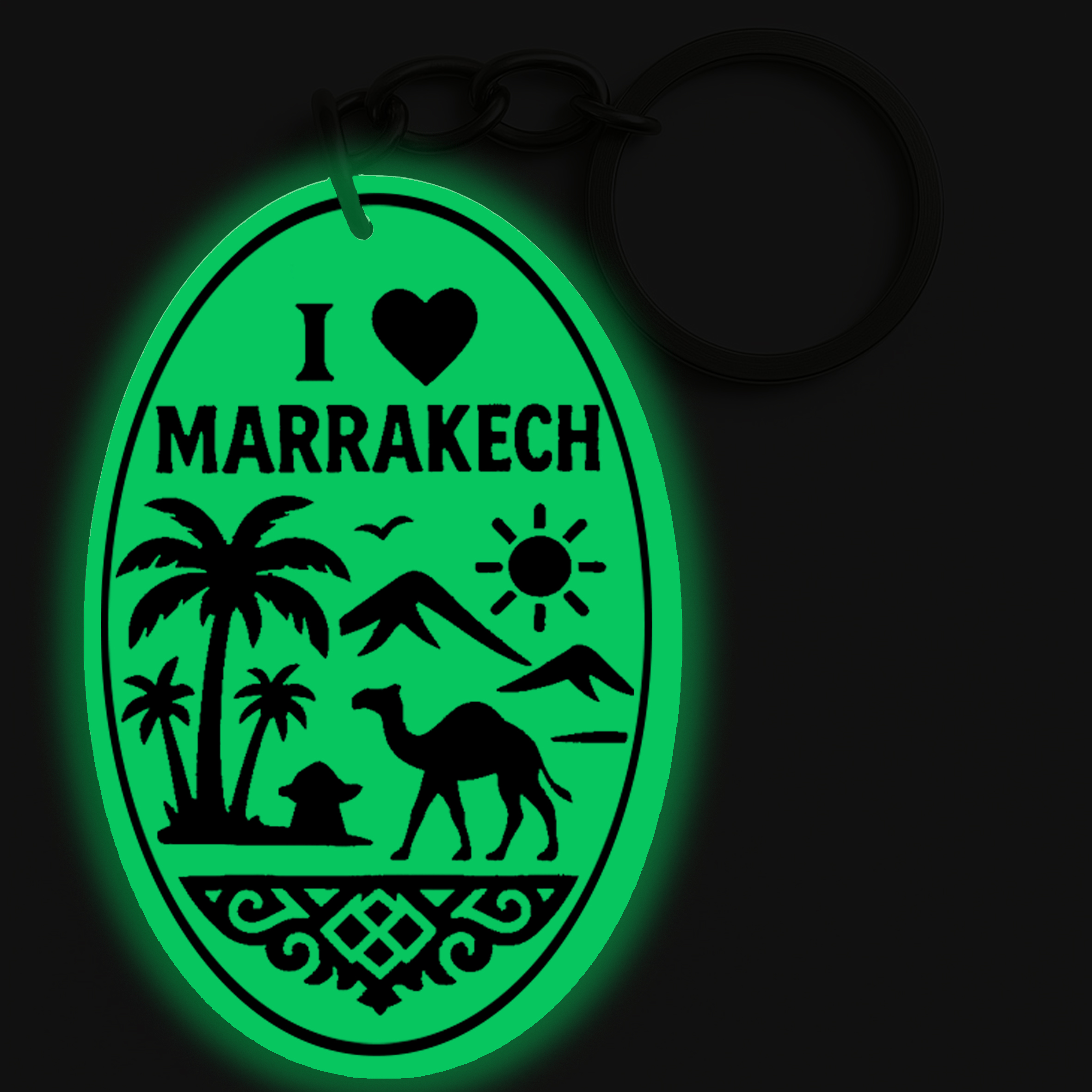 Exprimez votre style avec notre porte-clés photoluminescent « I 🖤 Marrakech », une pièce à la fois pratique et expressive. En plein jour, il attire l’attention par son design finement travaillé ; dans l’obscurité, il brille d’une lumière verte, vous permettant de retrouver vos clés en un clin d’œil.