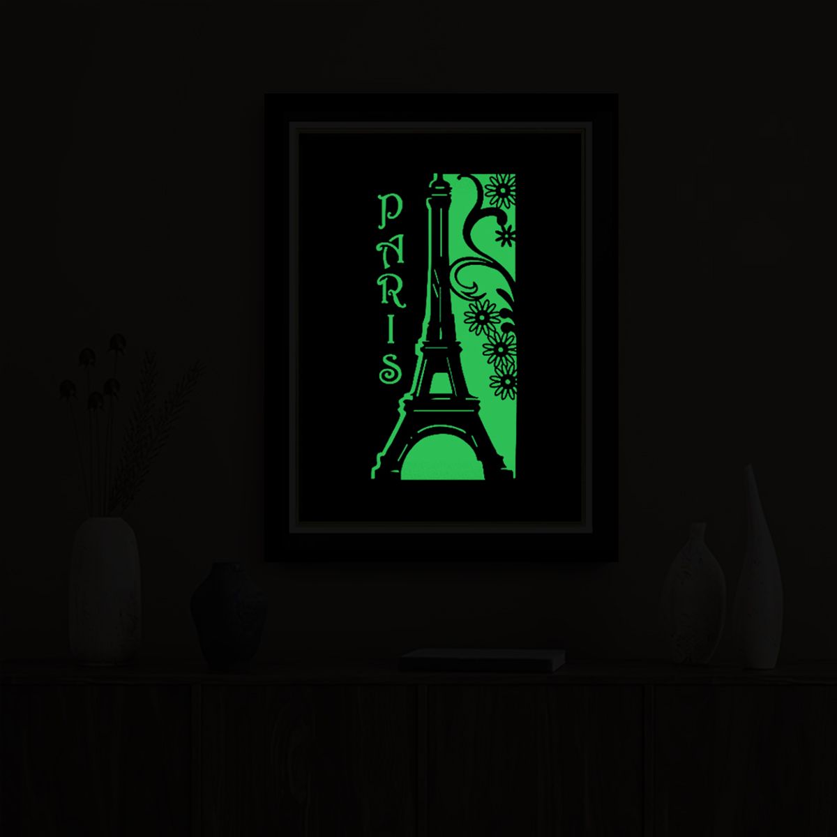 Offrez une touche moderne et élégante à votre espace avec nos tableaux photo lumineux. Dotés d’un design contemporain en noir avec cadre en verre, ils émettent une lumière verte dans l’obscurité, créant une atmosphère apaisante et captivante. Parfait pour illuminer votre intérieur de manière durable et esthétique.